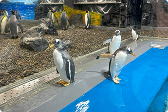またペンギン館では、空を飛ぶように泳ぐペンギンの姿を水中トンネルからみられます。イワシの大群が泳いでいる海洋大水槽がある海洋館ではさんごの海も大好評。ガラス張りの水面に乗ることができ、上から泳いでいる魚や珊瑚礁をみられます。