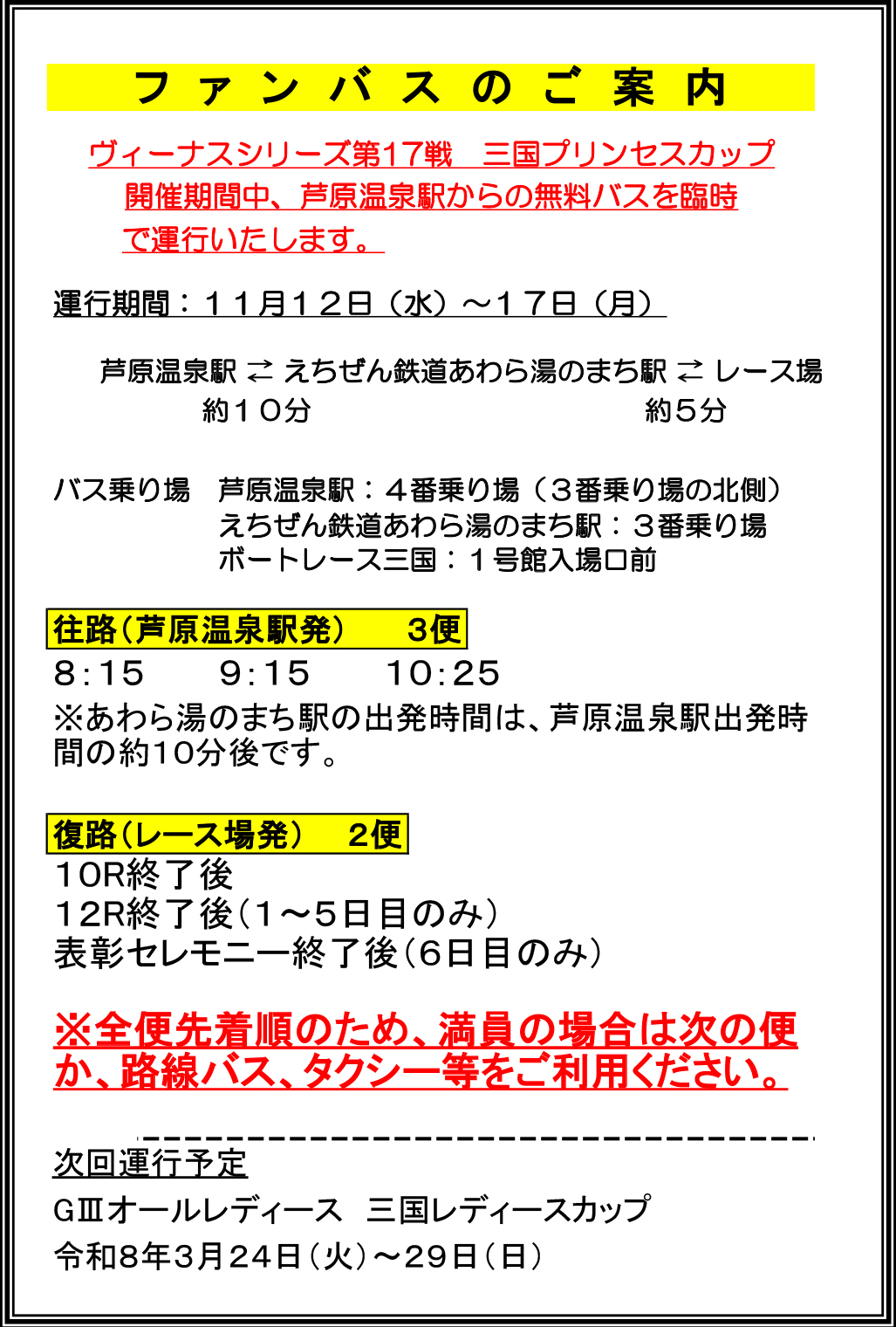 「ヴィーナスシリーズ第17戦三国プリンセスカップ」開催時(11/12~11/17)において下記のとおりファンバスの運行を行います。