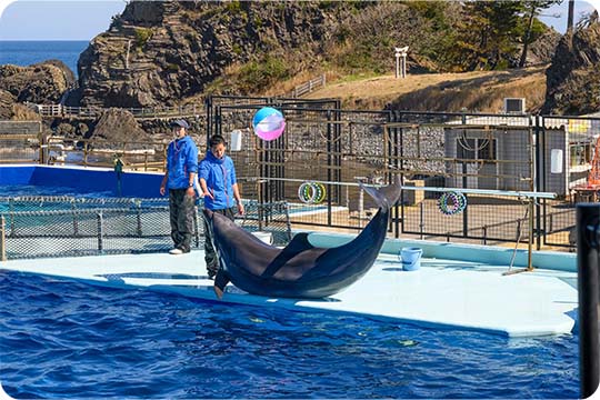 越前松島水族館は〝みて、ふれて、楽しく学べる〟がテーマの体験、体感型水族館。3頭のバンドウイルカによるイルカショーは楽しさいっぱい、迫力たっぷりのパフォーマンスで大人気。