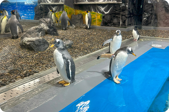 またペンギン館では、空を飛ぶように泳ぐペンギンの姿を水中トンネルからみられます。イワシの大群が泳いでいる海洋大水槽がある海洋館ではさんごの海も大好評。ガラス張りの水面に乗ることができ、上から泳いでいる魚や珊瑚礁をみられます。