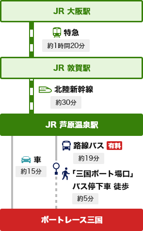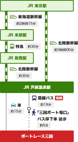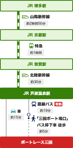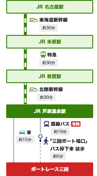 あわら湯のまち駅:3番乗り場 ※ えちぜん鉄道あわら湯のまち駅の出発時間は、芦原温泉駅出発時間の約10分後です。 ※ 満席の場合は次の便をご利用ください。 ※ 帰路バスは三国8R~12R終了後、1号館入場口前より発車いたします。